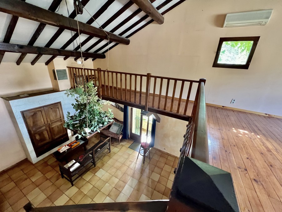 Maison avec jardin, sur deux niveaux, comprenant au rez-de-chaussée : une véranda, un vaste séjour-cuisine avec mezzanine ; 4 chambres, une salle de bains, une salle d'eau, un bureau, un atelier, un cellier et une buanderie. A l'étage, un studio indépendant. Terrasse, piscine, garage.