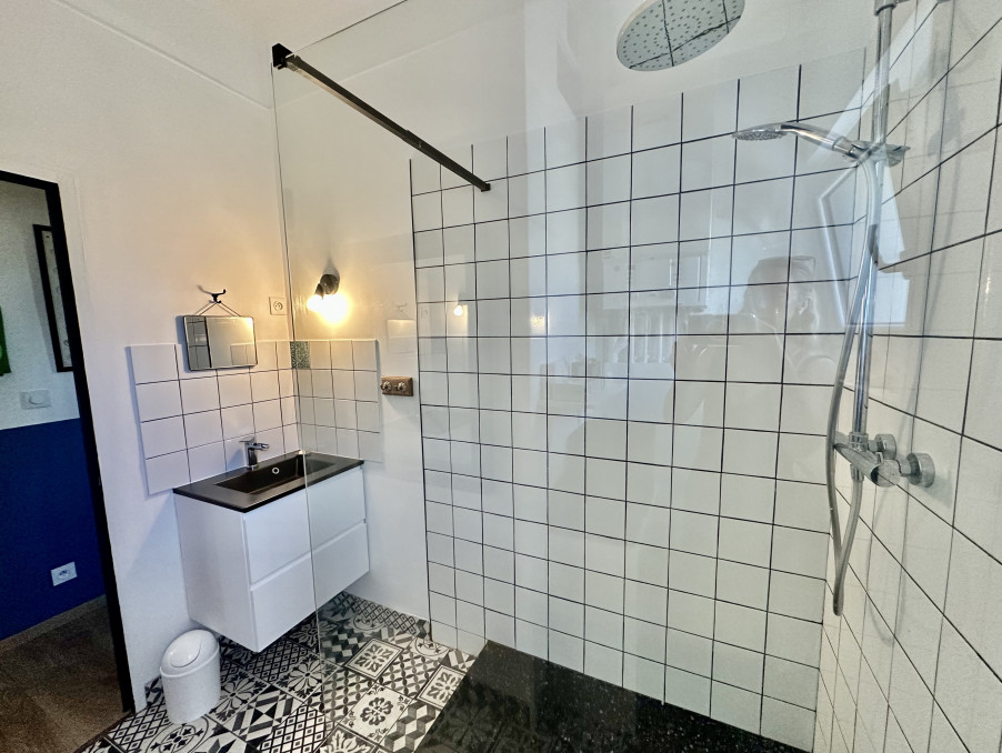 - Au premier niveau : un séjour-cuisine, une buanderie, une salle d'eau avec WC, une chambre, un salon et un bureau