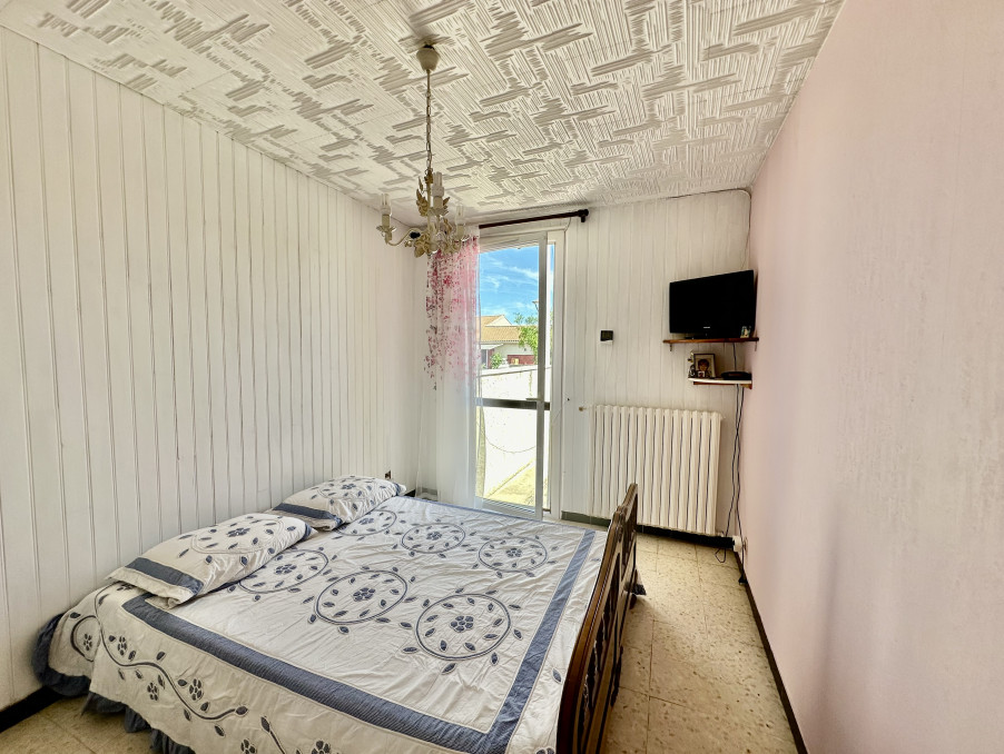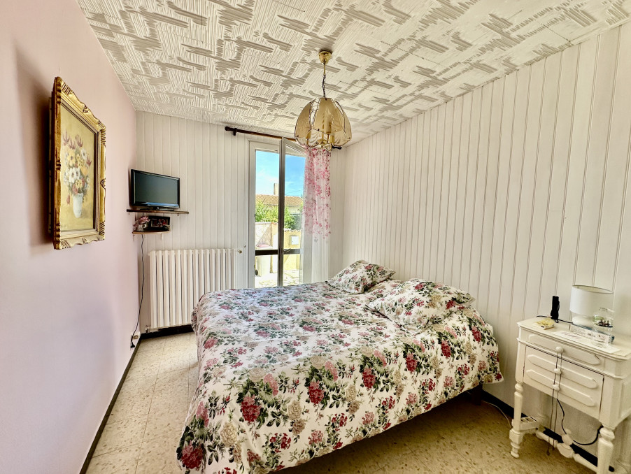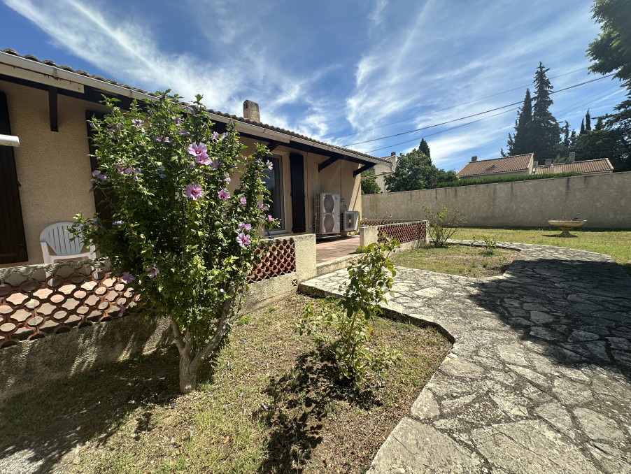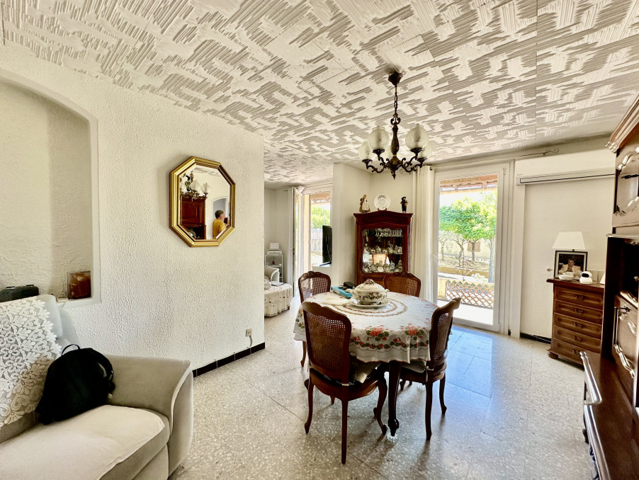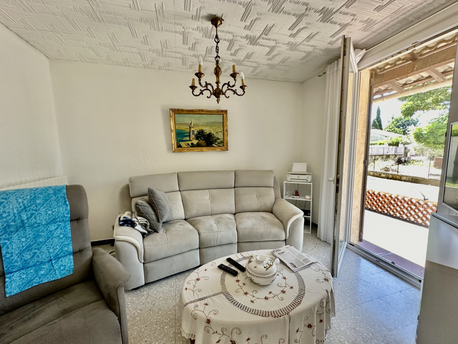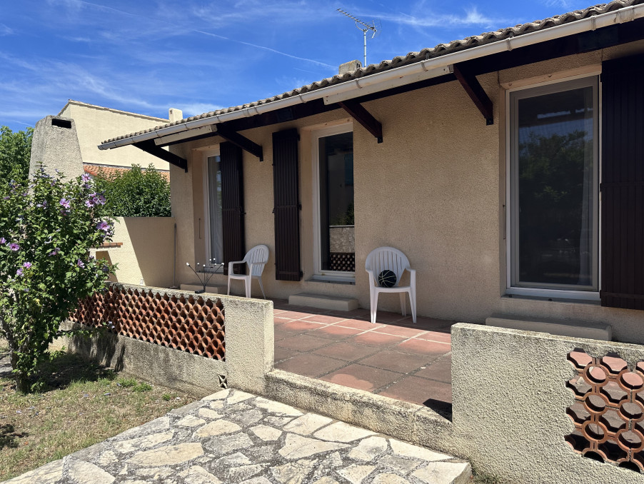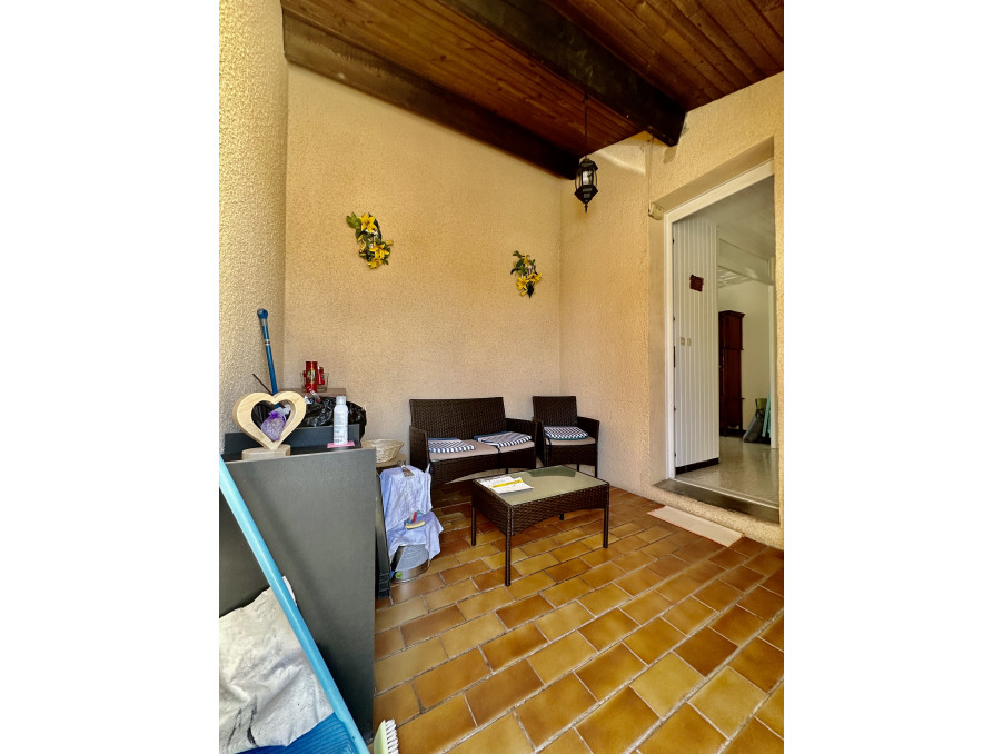 La maison, de plain-pied, est composée de deux chambres, un salon, un séjour, une cuisine, une salle d'eau, un WC, un petit dressing, et une véranda.Prestations : climatisation réversible installée en 2018, menuiseries PVC double vitrage, forage